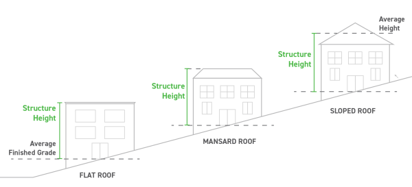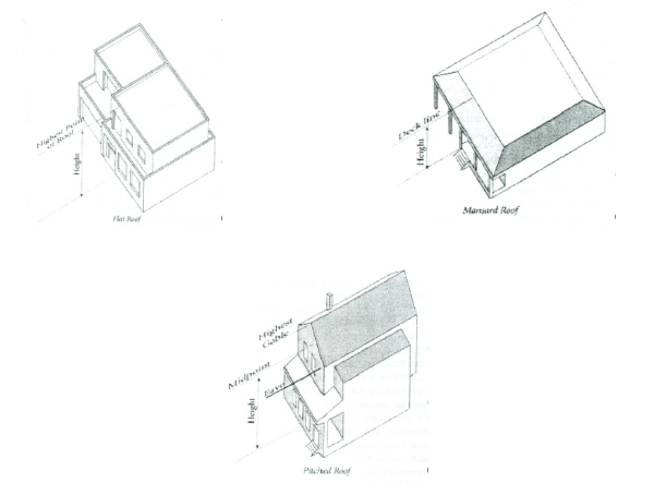 “Building Height.” The vertical distance measured from the established grade to the highest point of the roof surface for flat roofs; to the deck line of mansard roofs; and to the average height between eaves and ridge for gable, hip and gambrel roofs. Where a building is located on sloping terrain, the height may be measured from the average ground level of the grade at the building wall.